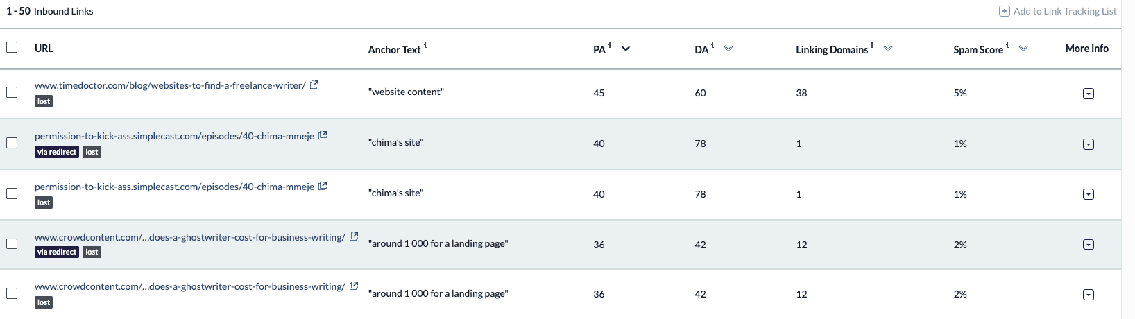 Scroll down to see who’s linking to you, the anchor text they use, and their Domain and Page Authority.
