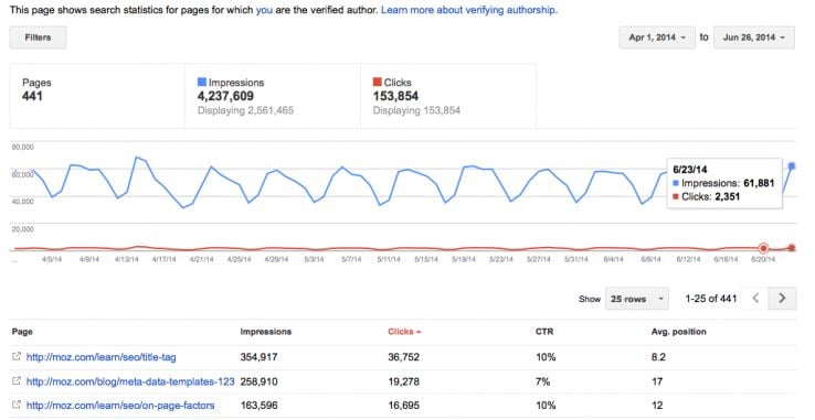 In the example above, search results associated with my authorship receive around 50,000 impressions a day, with an average of 1831 clicks, for an overall CTR of 3.6%.