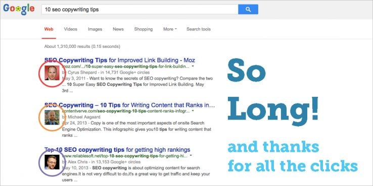 This one hits particularly hard, as I'm known as the guy who optimized his Google author photo. Along with many other SEOs, I constantly advise webmasters to connect their content writers with Google authorship. Up until now, would-be authors clamored to verify authorship, both for the potential of increased click-through rates, and also for greater brand visibility by introducing real people into search results.