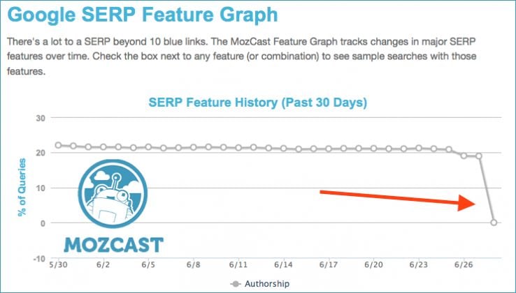 Update: As of June 29th, the MozCast feature graph shows traditional authorship snippets dropping to 0% of search results across all data centers. Previously, Google displayed authorship photos in 22% of all searches.