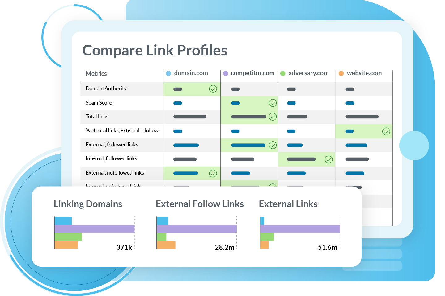 Monitor your Domain Authority® and Brand AuthorityTM and see how you stack up against your competitors in the Domain Overview tool. In Link Explorer, compare comprehensive link metrics like linking root domains, Spam Score, and followed link counts.