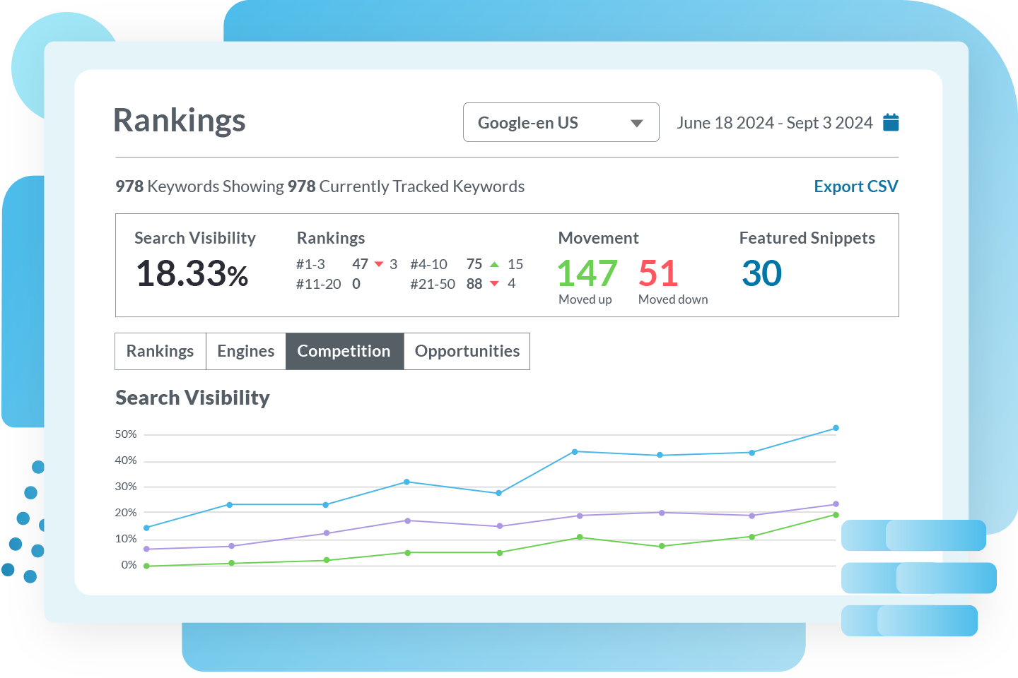 Once you’ve identified your true competitors, monitor their performance for your target keywords with ongoing rank tracking in Moz Pro Campaigns. Track up to three competitors side-by-side and see how they rank each week.