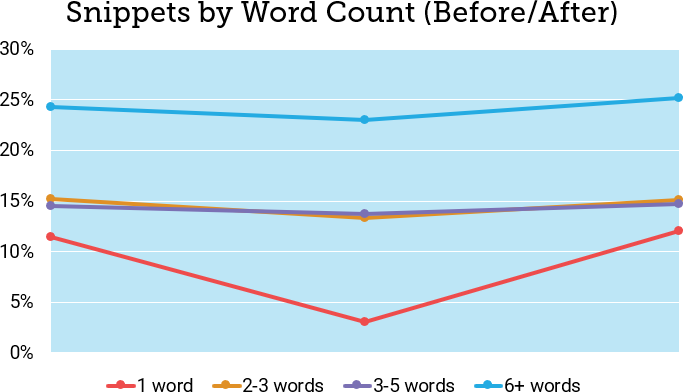 Our original study of the drop showed dramatic differences by query length. Here's a breakdown by four word-count buckets for the before and after Featured Snippet prevalence (the data points are February 18, February 19, and March 12):