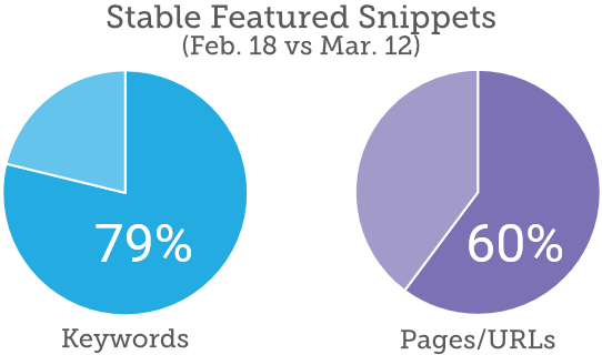 Looking at the keywords in MozCast that had Featured Snippets on February 18, 79% of those same keywords still had Featured Snippets on March 12. So, we're down 21% already. If we narrow the focus to keywords that retained their Featured Snippets and displayed the same page/URL in those Featured, we're down to 60% of the original set.