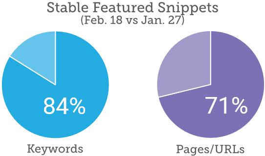 While these numbers are a bit better than the post-recovery numbers, we're still seeing about three out of 10 keywords either losing a Featured Snippet or changing the Featured Snippet URL. Keep in mind that Featured Snippets are pulled directly from page-one organic results, so they're constantly in flux as the algorithm and the content of the web evolve.