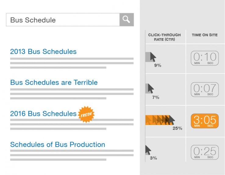 For example, if users consistently click a search result further down the list, and they spend much more time engaged with that page than the other results, this may mean the result is more fresh and relevant.