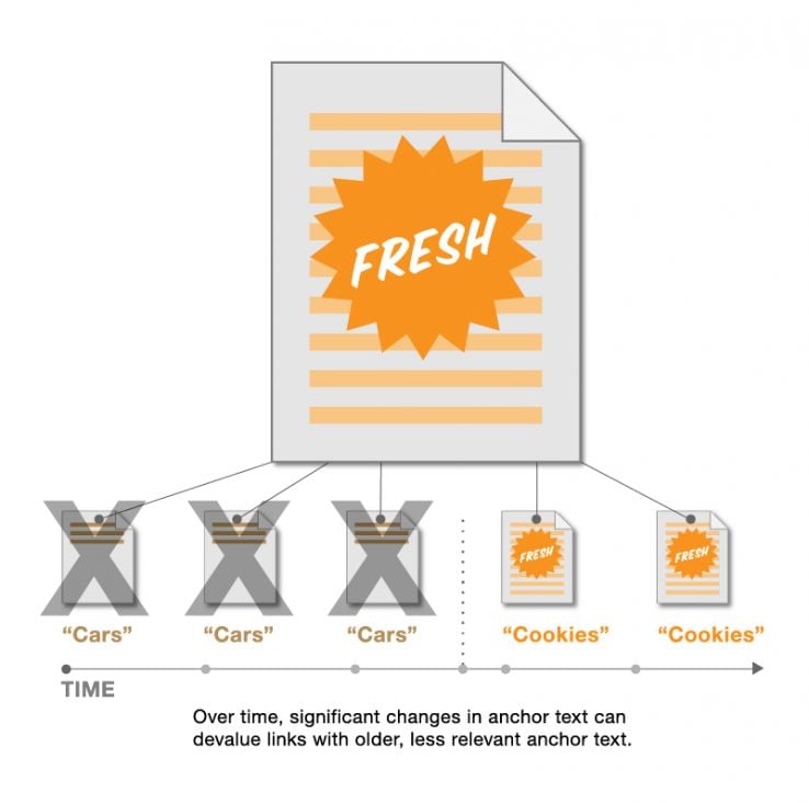 "The date of appearance/change of the document pointed to by the link may be a good indicator of the freshness of the anchor text based on the theory that good anchor text may go unchanged when a document gets updated if it is still relevant and good."