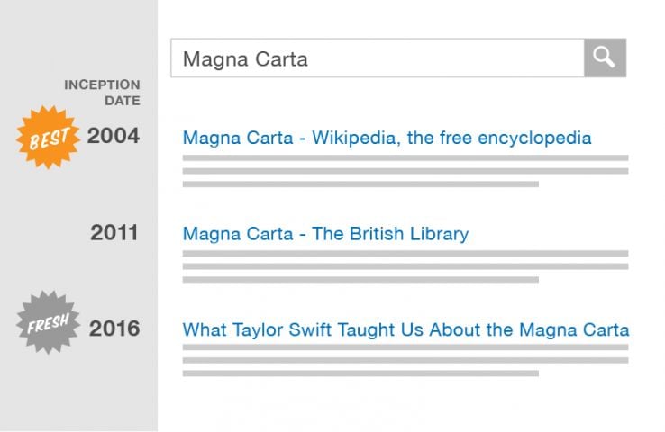 Google understands the newest result isn’t always the best. Consider a search query for “Magna Carta." An older, authoritative result may be best here.