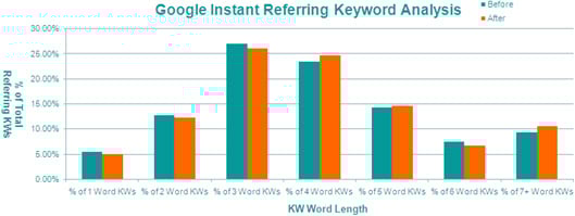 Hmm... Looks pretty darn similar to me. A tiny increase in 4, 5 and 6 word phrases would seem to go against many of the prognostications and fears that this move would decimate the long tail (though, to be fair, plenty of savvier search folks predicted a slight increase as Google's "Suggest" function would be more obvious/visible to searchers and push them to perform more specific queries).