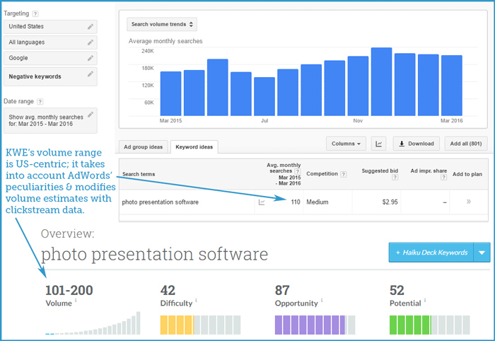 Luckily, there is more than one way to get at and improve the Keyword Planner data using clickstream data sources. Our own Keyword Explorer tool has around 95% accuracy with Google AdWords monthly keyword volume.