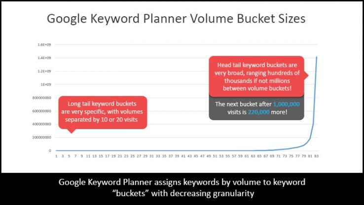 After analyzing a massive data set, we found that Google has around 85 different "buckets" for traffic, which are logarithmically proportioned. This means that long tail keywords might fall into buckets which only differ by 10–20 searches at a time, while head tail keywords might see gaps of hundreds of thousands of searches per month. The bigger the search volume, the less certain you can be about the accuracy of the Average Monthly Searches, especially relative to other terms that fall in the same group. In fact, the largest buckets have variances of of nearly a quarter million searches per month!