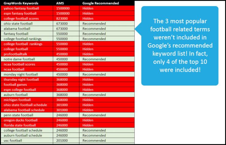 The top 3 most-trafficked football-based keywords weren't recommended to us, and only 4 of Google's recommended made it into the top 10. In fact, when we analyzed dozens of Google keyword recommendation reports, we found that only 35% of the keywords were among the most trafficked terms.