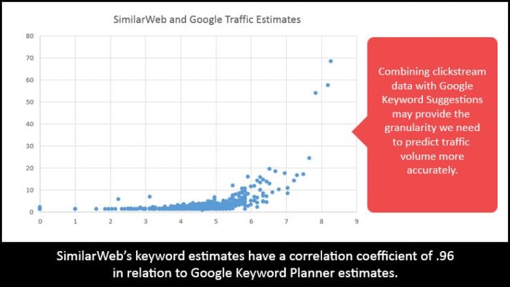 While this data from SimilarWeb is very useful, building a more accurate prediction of search volume for a term requires that you build a regression model comparing the user data to Google's estimates. Moreover, demographic differences between the whole Google user base and those included in the user panels of SimilarWeb and ClickStre.am mean that building a ubiquitous regression model across all the keyword data might not be the best, as the users tracked by SimilarWeb and ClickStre.am might be biased towards different topics. The solution is to build models around topically-related keywords.