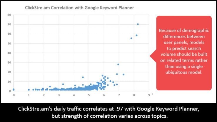 We know of two other keyword data sources — ClickStre.am and SimilarWeb — which correlate nicely with Google Keyword Planner volumes.