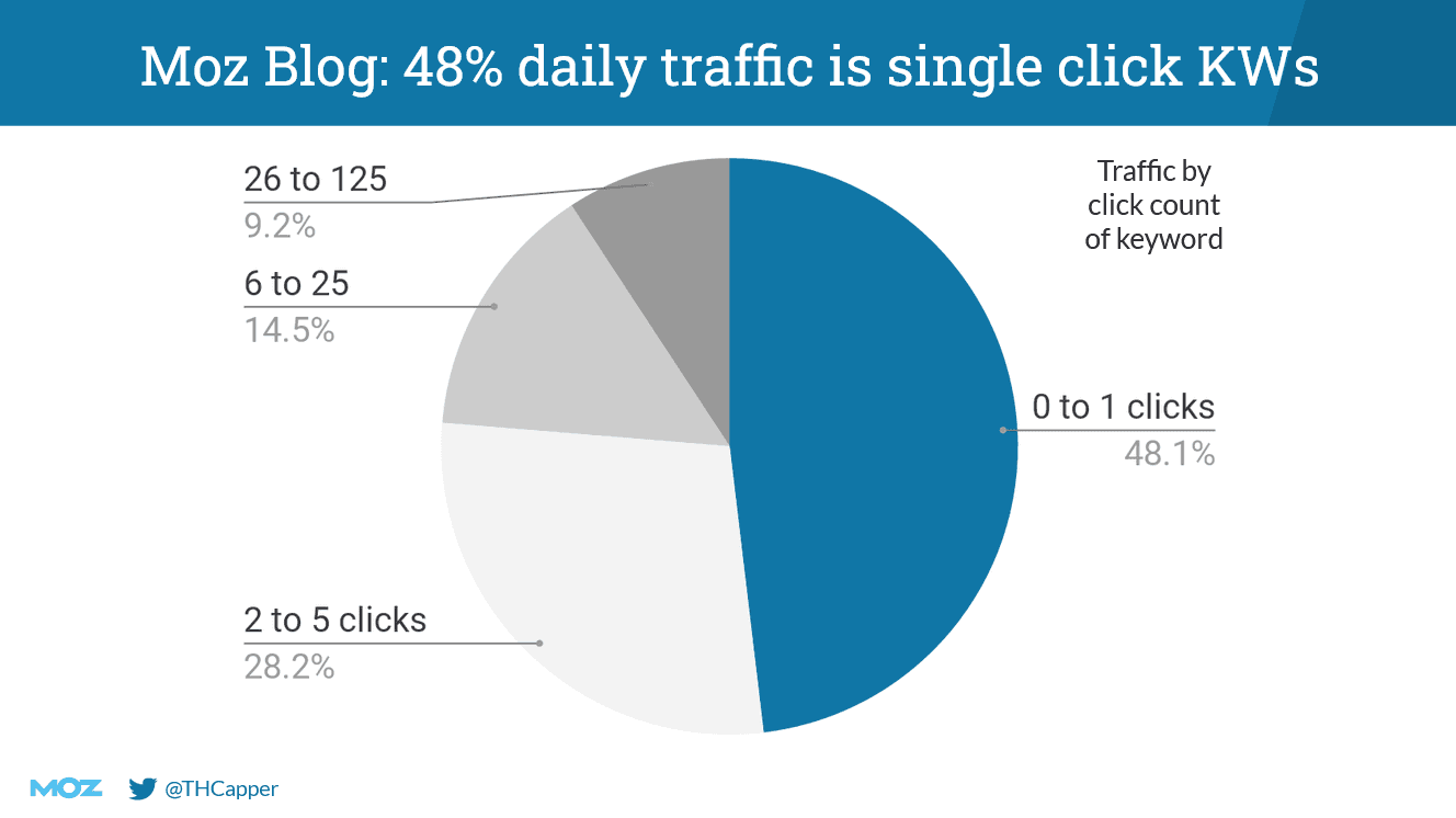 The very blog you’re reading right now gets 48% of its daily traffic from keywords that drive only a single click. And it’s not like we’re getting the same selection of low-traffic keywords every day, either. Google themselves have said repeatedly that 15% of the keywords they see every day are totally new to them.