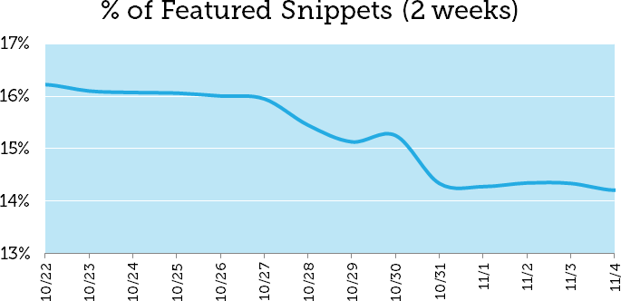 Near the end of October (far-right of the graph), we saw our first significant dip (spotted by Brian Patterson and Chris Long on SEL). This dip occurred over about a 4-day period, and represents roughly a 10% drop in searches with Featured Snippets. Here's an enhanced, 2-week view (note: Y-axis is expanded to show the day-over-day changes more clearly):
