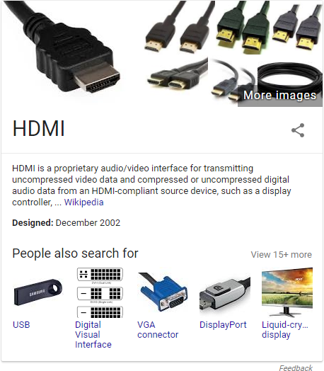 These new panels account for the vast majority of the lost Featured Snippets I've spot-checked, and all of them are general Knowledge Panels coming directly from Wikipedia. In some cases, Google is using a more generic Knowledge Graph entry. For example, "HDMI cables", which used to show a Featured Snippet (dominated by Amazon, last I checked), now shows no snippet and a generic panel for "HDMI":
