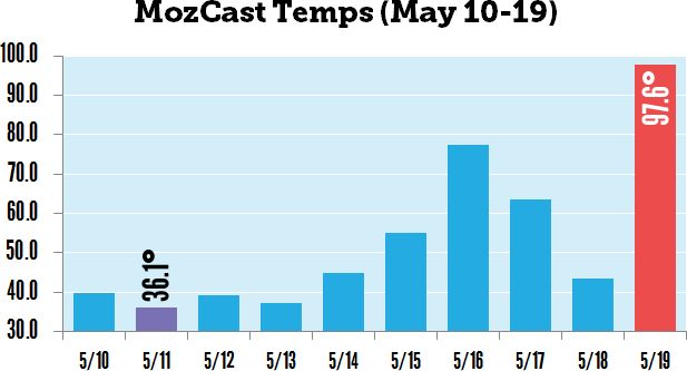 After a period of relative quiet, MozCast detected a major "temperature" spike in Google's algorithm at some point on Monday, May 19th. This occurred after some historic lows, including the 3rd coldest day on record (May 11th).