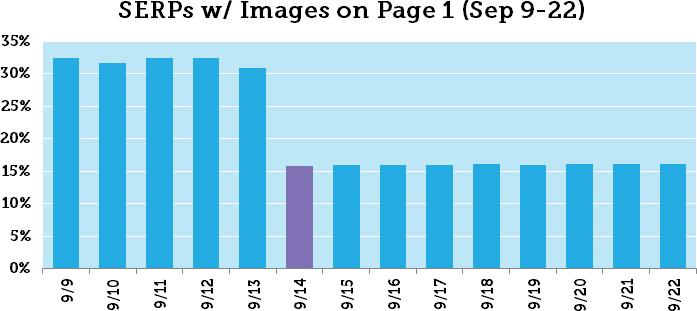 Second, between September 13th and 14th there was a massive drop in SERPs with image (vertical) results on page 1 in our data set. This caused substantial volatility, as image results occupy an organic position and so those SERPs got an extra organic result on page 1. The temperature that day was 111°F. Here’s the two-week graph of SERPs with image results on page 1: