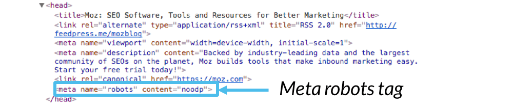 The meta robots tag, commonly known as “meta robots” or colloquially as a “robots tag,” is part of a web page’s HTML code and appears as code elements within a web page’s < head> section: