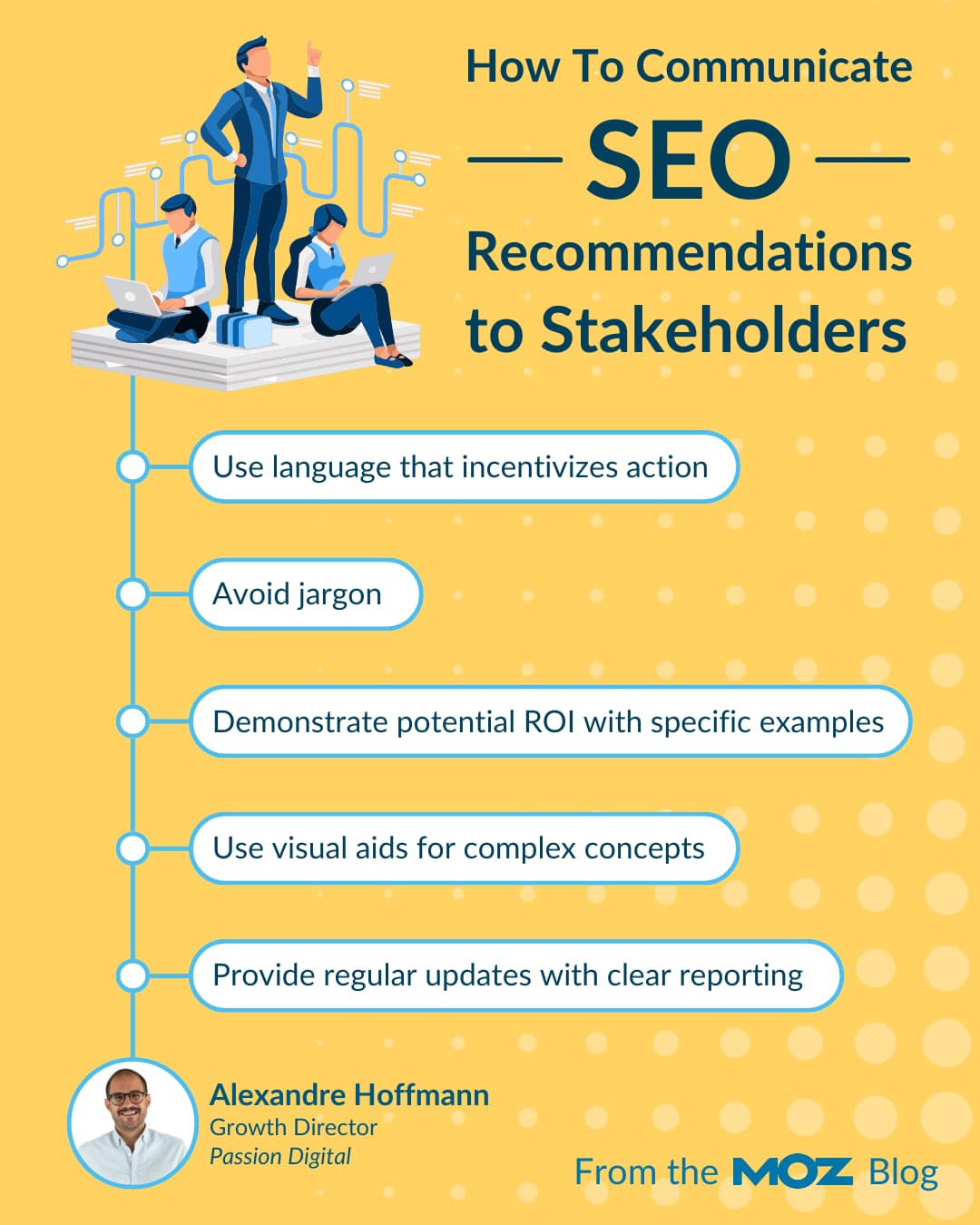 Explain the reasoning behind your SEO recommendations and how they fit into the bigger picture. When people understand the ‘why’ behind the ‘what’ they’re more likely to buy in.
