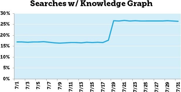 The morning of July 19th there was a major Google update, and no one is talking about it. Put simply: We missed it, because we just weren't looking for it. Overnight, the number of queries we track in the MozCast 10K beta system that show some kind of Knowledge Graph jumped from 17.8% to 26.7%, an increase of over 50%. This was not a test or a one-day fluke — here's a graph for all of July 2013 (as of August 20th, the number has remained stable near 27%):