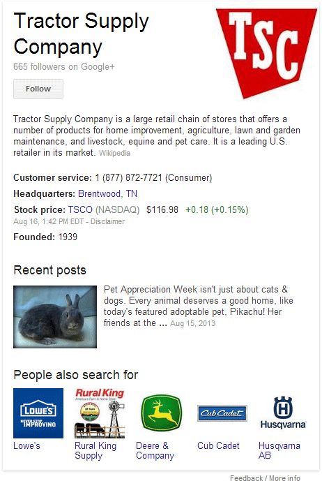 At a glance, 16 of these seem to be known brands (I think we can count "ancestry" and "cheap tickets" as brand queries in 2013), with "forex", "tractor supply", "discount tire", and "nectar" not having obvious brand associations. We'll come back to "forex" (I discovered something interesting there), but Google is treating both "tractor supply" and "discount tire" as brand queries. The Knowledge Graph for "tractor supply" shows: