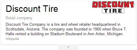 A search for "discount tire" shows a smaller, expanding KG entry, below ads and a map (for my search, at least):