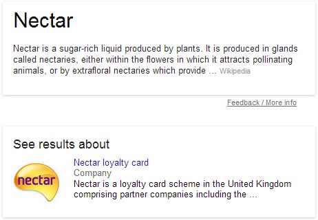 The one clear outlier in this group was the search for "nectar", which pulled up two KG-style entries (we classify them pretty loosely, to throw a wide net): (1) an answer-box style entry (but in the right-hand column), and (2) a disambiguation box: