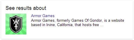What's funny is that Google doesn't display a "Showing results for…" spelling correction or seem to think that I actually meant "armor" when I typed "army". They've just chosen to give a fairly unrelated entity a bit of extra credit. All of the top 10 rankings are based on "army" and there is no mention of Armor Games outside of the KG entry.