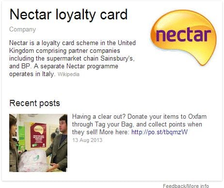 In the comments, Will Critchlow pointed out that Nectar is a well-known brand in the UK. When you search "nectar" on Google.co.uk, the entity/brand association is much clearer:
