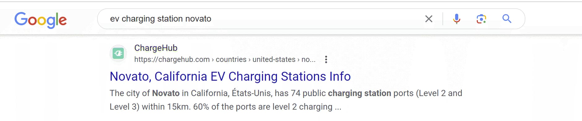 Title tags appear as clickable blue links for a webpage in Google search results. For example, a SERP result might display a title tag like “Novato, California EV Charging Stations Info.”