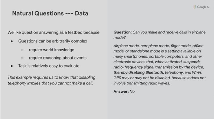 One thing I just have to mention because I honestly cannot get this out of my head is this Keynote by Jeff Dean of Google. He's speaking about BERT and then goes into natural questions and natural question understanding. The big takeaway for me was this example around, okay, let's say someone asked the question, "can you make and receive calls in airplane mode?"