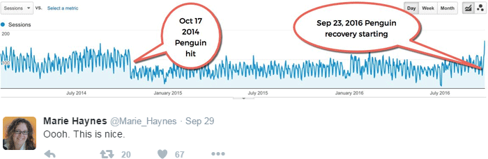 Google representatives are confirming details about the new Penguin both publicly and privately, and algorithm flux matches the general timeline. Perhaps more importantly, we're seeing many anecdotal reports of Penguin recoveries, such as: