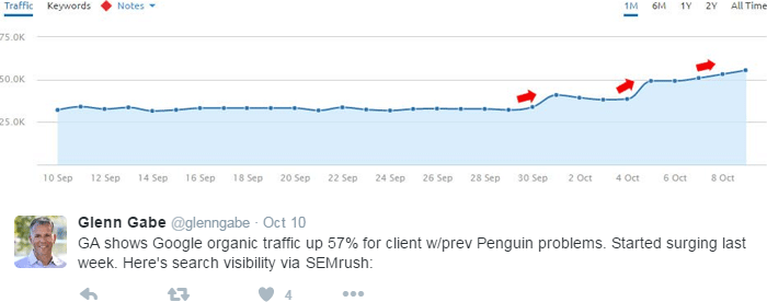 Given the severity of Penguin demotions and the known and infrequent update timelines, these reports are unlikely to be coincidences. Some of these reports are also coming from reliable sources, like Marie Haynes (above) and Glenn Gabe (below), who closely track sites hit by Penguin.