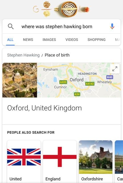 On mobile, I at least have the option to peruse organic results. On Google Home, if I ask the same question ("Where was Stephen Hawking born?"), I get no SERP at all, just the answer: